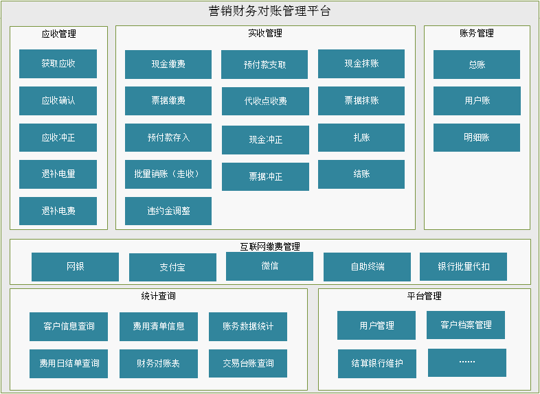 營(yíng)銷財(cái)務(wù)對(duì)賬管理平臺(tái)為企業(yè)繳費(fèi)結(jié)賬、與財(cái)務(wù)實(shí)現(xiàn)自動(dòng)化對(duì)賬提供了統(tǒng)一標(biāo)準(zhǔn)、服務(wù)與接口,滿足傳統(tǒng)實(shí)體營(yíng)業(yè)廳、自助服務(wù)終端、銀行代扣到微信、支付寶互聯(lián)網(wǎng)等繳費(fèi)方式統(tǒng)一接入平臺(tái),支撐企業(yè)財(cái)務(wù)統(tǒng)一對(duì)賬管理,推動(dòng)企業(yè)為客戶提供快速、高效、便捷服務(wù),提升企業(yè)賬務(wù)管理水平。