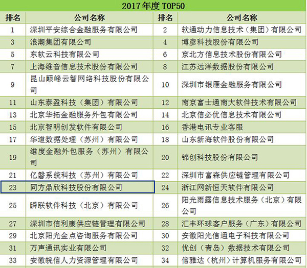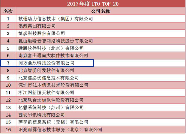 近日,同方鼎欣從近千家企業(yè)中脫穎而出,憑借良好的企業(yè)綜合實(shí)力和行業(yè)影響力成功入選由知名研究咨詢機(jī)構(gòu)鼎韜組織評(píng)選的2017年度中國(guó)最具影響力服務(wù)外包企業(yè)五十強(qiáng)(TOP50)及2017年度中國(guó)最具影響力ITO企業(yè)二十強(qiáng)(ITO TOP20)榜單。