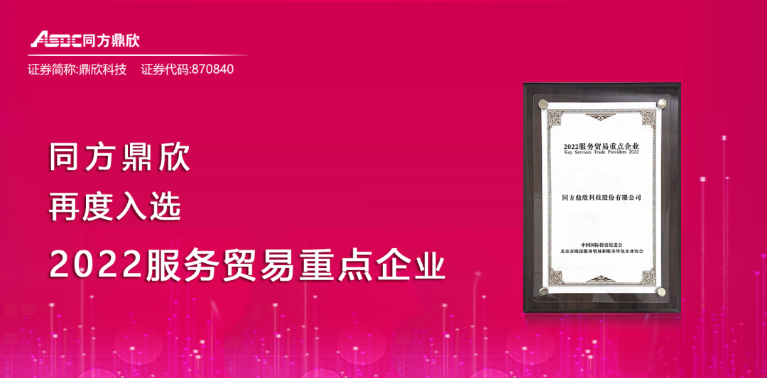 2022年8月31日-9月5日,由中華人民共和國(guó)商務(wù)部和北京市人民政府共同主辦的2022年中國(guó)國(guó)際服務(wù)貿(mào)易交易會(huì)(簡(jiǎn)稱“服貿(mào)會(huì)”)在北京國(guó)家會(huì)議中心和首鋼園區(qū)雙會(huì)場(chǎng)同時(shí)舉辦,本屆服貿(mào)會(huì)是以“服務(wù)合作促發(fā)展·綠色創(chuàng)新迎未來(lái)”為主題。作為我國(guó)數(shù)字貿(mào)易領(lǐng)域知名企業(yè),同方鼎欣受邀參與本屆服貿(mào)會(huì)“2022數(shù)字貿(mào)易發(fā)展論壇”分論壇,并再度入選“2022服務(wù)貿(mào)易重點(diǎn)企業(yè)”推介名單。