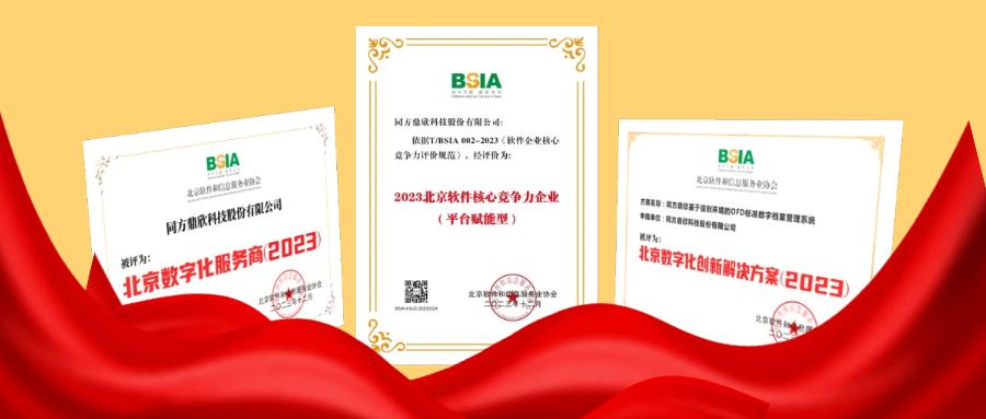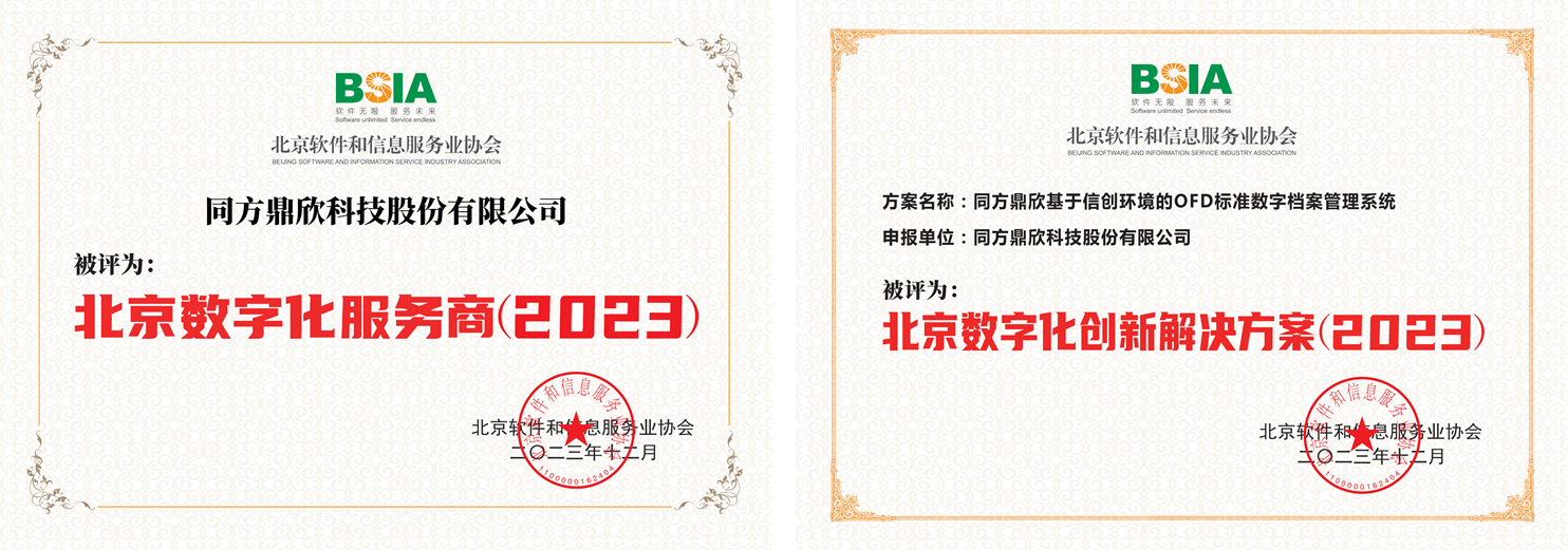 2023北京軟件企業(yè)核心競爭力評價企業(yè)”根據(jù)2020年修訂的新版《北京軟件企業(yè)核心競爭力評價規(guī)范》團體標(biāo)準(zhǔn),以軟件企業(yè)綜合素質(zhì)為基本要求,分別評選出平臺賦能型、技術(shù)研發(fā)型、市場應(yīng)用型和業(yè)務(wù)探索型等4大類型企業(yè)。同方鼎欣再度獲評“2023北京軟件核心競爭力企業(yè)(平臺賦能型)及“北京數(shù)字服務(wù)商(2023)”,并以公司自主研發(fā)的“基于信創(chuàng)環(huán)境的OFD標(biāo)準(zhǔn)數(shù)字檔案管理系統(tǒng)”,獲評“北京數(shù)字化創(chuàng)新解決方案(2023)”。