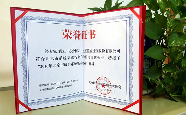 2016年北京市誠(chéng)信系統(tǒng)集成企業(yè)榮譽(yù)證書(shū)