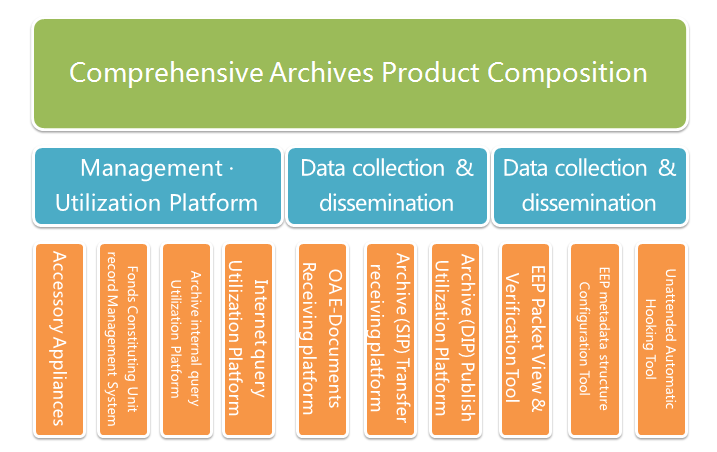 To superior, opening archives data interface smoothing the electronic data transfer; To external, providing network query, borrowing, government affairs, patriotism education and other informationized services to the government and public by releasing modules; To subordinate, supporting received platform, which receives Electronic archives from subordinate funds constituting unit in loop, smoothness and safety.