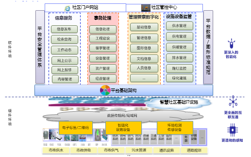 スマートコミュニティは環(huán)境層、データ層、サポートプラットフォーム層、応用層を含める総合管理システムであり、情報(bào)ネットワーク、自動(dòng)化制御、知能識(shí)別などの技術(shù)を利用して、コミュニティ要素のデジタル化、施設(shè)設(shè)備の知能化、情報(bào)リソースのネット化、日常管理の可視化を?qū)g現(xiàn)します。