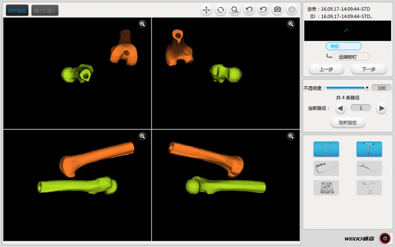 進(jìn)入實(shí)時(shí)導(dǎo)航模式時(shí),系統(tǒng)將提前規(guī)劃的復(fù)位路徑指令傳遞給復(fù)位機(jī)器人。導(dǎo)航軟件中規(guī)劃髓內(nèi)釘入釘點(diǎn)方位,將指令發(fā)給定位機(jī)器人,機(jī)器人自動(dòng)指示入釘點(diǎn)方位,外科醫(yī)生置入導(dǎo)向套筒,電鉆打入克氏針,置入股骨髓內(nèi)釘。導(dǎo)航軟件中規(guī)劃髓內(nèi)釘遠(yuǎn)端鎖釘方位,將指令傳遞給定位機(jī)器人,機(jī)器人自動(dòng)指示鎖釘方位,外科醫(yī)生置入導(dǎo)向套筒,電鉆打入克氏針,置入遠(yuǎn)端鎖釘。對骨折復(fù)位操作進(jìn)行自動(dòng)路徑規(guī)劃和預(yù)覽,確保復(fù)位過程不會(huì)發(fā)生骨骼間的碰撞。