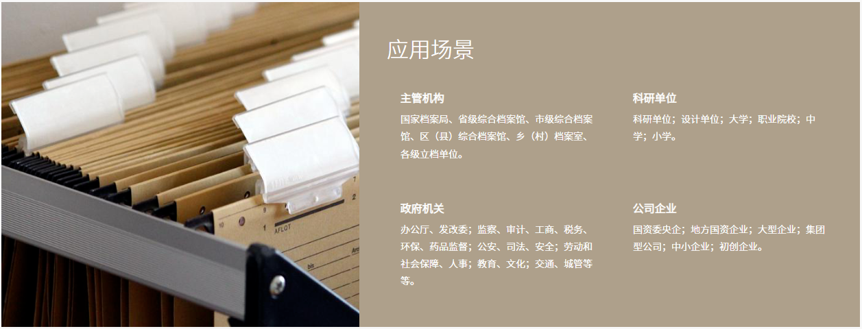 公司深耕檔案信息化領(lǐng)域,構(gòu)建安全、自主、可控產(chǎn)品,依托國產(chǎn)化生態(tài)環(huán)境推動人工智能、區(qū)塊鏈、大數(shù)據(jù)和云計(jì)算等技術(shù)的創(chuàng)新運(yùn)用,為各省市檔案局館、高校、科研院所、政府機(jī)關(guān)、企業(yè)集團(tuán)等提供檔案咨詢及數(shù)字檔案館室/智慧檔案館/集成工程的建設(shè)與數(shù)據(jù)分析檢測、檔案SaaS平臺等全產(chǎn)業(yè)鏈檔案信息。